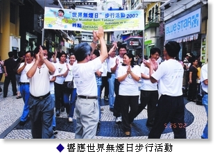 為響應2002年5月31日「世界無煙日」的主題:“Tobacco free sports-play it clean” 喚起青少年認識吸煙的禍害,由澳門特區政府衛生局、社會工作局、體育發展局、環境委員會、澳門中華學生聯合總會、澳門童軍總會聯合舉辦的「世界無煙日」步行活動於5月26日下午舉行,超過一千名學生及巿民參與。是次活動獲得老、中、青各年齡層巿民的熱烈響應,將反吸煙的決心以實際行動向廣大市民及青年傳播。