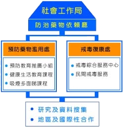 三.藥物依賴防治工作 (一)社會工作局 防治藥物依賴廳 澳門特區政府社會工作局轄下防治藥物依賴廳負責統籌和執行藥物濫用的防治工作,整體策略主要按以下幾個方向發展:推行預防藥物濫用的教育及宣傳、直接提供戒毒治療和復康服務、搜集和分析藥物依賴領域內的重要資料及數據,進行相關的研究工作,以及參與地區和國際性的禁毒合作。