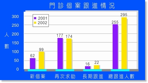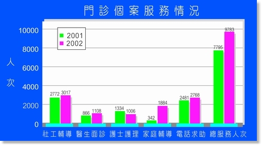 圖2. 門診個案服務人次分析,2002年總服務人次超越去年之總數,主要由於個案數目增加,門診部加強對家庭輔導,及推出不同之醫療服務,例如尿檢、身體檢查等項目。至目前為止,