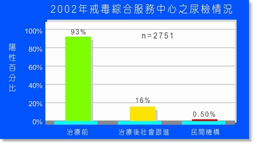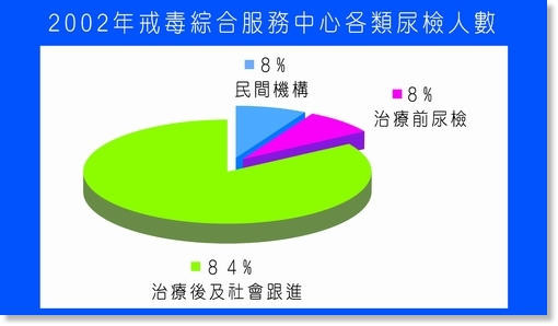 圖3. 2002年戒毒門診部一共進行2,751次驗尿測試,偵測個案使用毒品之情況。于2002 年度開始,已向民間戒毒機構提供驗尿測試服務,驗尿測試目前主要用於個案康復跟進,佔84%。對監控和評估個案之操守起重要作用。