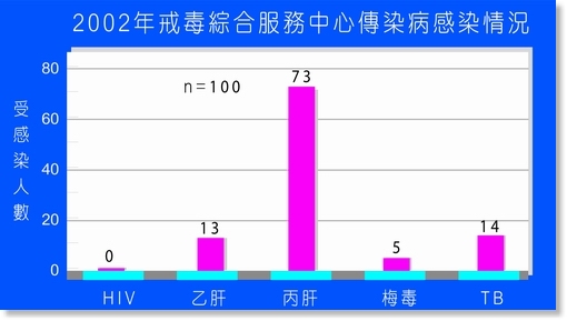 圖5. 2002年下半年一共為100名戒毒者進行108次之體檢,其中乙型及丙型肝炎感染率十分高,值得關注及研究相應措施。有關之體檢對有效監控傳染病之蔓延情況十分有用。 社會心理輔導: 主要由社工負責,為個案提供專業輔導、加強戒毒動機,以及建立可行之治療計劃,具體內容包括給予社會支援及關懷、加強其改變之信心、闡明其改變之理由、協助其建立正向之活動模式、及預防重吸等。其他特殊治療還包括工作治療、生活技能培訓、情緒管理、危機介入等。於 2002年間,提供之社會心理輔導達3,017人次(圖2)。 社會重返及經濟援助: 主要協助個案重返社會及家庭,處理家庭問題、提供家庭輔導、協助家人處理吸毒問題;針對年老、傷殘、或經濟有困難之個案及家庭,提供經濟援助,並對已申領援助金的康復個案進行跟進及操守監管。在2002年期間提供了1884次家庭輔導,而每月平均跟進約30多個接受援助金之個案。 1.2 初級治療部 負責提供短期式身體脫毒住院治療,主要醫療及處理因藥物依賴而引起之戒斷症狀及其他身體不適,為長期的戒毒工作建立更好基礎。該部門能提供8-10個床位,平均治療期約為14天。治療模式方面,目前使用可樂定療法,及正對丁丙諾非治療法進行試驗。具體運作方面,入院之個案需由門診評估及轉介,在離院後將轉介到民間戒毒機構作長期之康復治療,或直接由門診社工作長期之社會跟進。為更有效推行工作,該部門還透過與「澳門更新互助聯誼會」合作,住院部同工由該會派出過來人擔任,一方面為戒毒康復者提供工作機會,另一方面亦藉此培訓專業之過來人同工,作為戒毒工作人員之培訓實習基地。自2002年9月開始,住院服務正式投入運作,至2002年底共有31名住院個案,目前正進行戒毒治療法之臨床比較,期望能為戒毒治療收集科學資料。