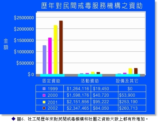 財政資助方面,社工局於2002年間,在固定資助、設備及其它資助方面,均較去年有所增加。主要提升之資助用於加強機構之服務素質,以提供多元化之康復活動。例如固定資助增加之部份主要用作協助機構聘請專業社工人員,對提升服務質素方面,將起一定之作用。而設施及設備方面,主要用於加強消防之安全設備、文娛康體設備等。具體之資助情況,簡述如下: