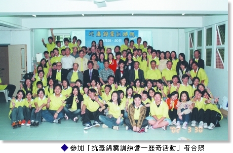 社會工作局於2002年3月首次與『國際獅子會總會港澳303區青年拓展及禁毒警覺委員會』及『香港戒毒會』在澳門合辦一項名為『抗毒錦囊訓練營』的活動,該訓練營已在香港舉辦多年,效果理想。 『抗毒錦囊訓練營』對象主要是中學生,目的是透過團體訓練、專題講座及分組討論等形式,來加強青少年對毒品禍害的認識和提升生活技能,使青少年更懂得去面對生活上的壓力和困難,免受不良影響以及體驗健康人生的可貴。是次『訓練營』本澳共有三間中學的56名初中學生及港澳20名青年義工參加並取得美好的成果。