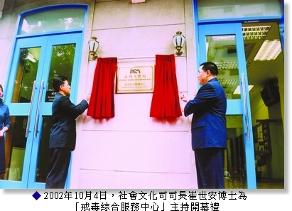 * 於10月4日舉行「戒毒綜合服務中心」開幕典禮,邀得社會文化司司長崔世安博士、社會工作局葉炳權局長、衛生局瞿國英局長、司法警察局黃少澤局長及澳門監獄李錦昌獄長主禮,並有眾多來自澳門和香港之嘉賓出席。短期住院脫毒的醫療服務隨即正式展開,中心各項工作陸續投入運作,本澳戒毒工作邁向新里程碑。 * 與「澳門更新互助聯誼會」合作,由該會安排戒毒康復會員,承擔「戒毒綜合服務中心」初級治療部的雜務工作及中心週邊山坡草地的清潔維修工作。藉此向康復者提供職業培訓和實際工作,以協助會員更好地重返社會以及提高預防重吸的效能。