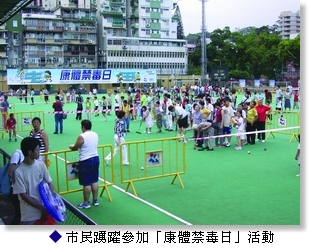 由社會工作局與體育發展局合辦的「康體禁毒日」於6月23日在塔石球場舉行,是一項以體育運動來宣揚健康生活和對抗毒禍的活動。當天除了球類比賽項目外,亦包括多個不同類型、具有抗毒意識的小型康體運動。參加者當中,大部份是以家庭組合一同參與,活動氣氛溫馨愉快,約有二千多人參與。