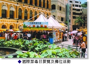 主題為「共創無毒社區」的禁毒展覽及攤位遊戲,於6月26日「國際禁毒日」當天假議事亭前地舉行,是項活動由社工局聯合十多個相關的政府部門及民間機構共同籌辦。透過圖片展覽及攤位活動,進一步提高市民對禁毒工作的認識及抗毒意識,從而加強預防教育的工作。
