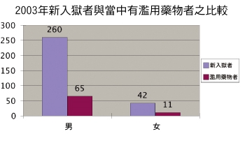 根據監獄之統計資料顯示,2003年共有920人被囚禁在監獄,其中男性的囚犯有820人,女性有100人。當中新入獄者共有302人,其中男性有260人,女性有42人。新入獄者當中,有濫用藥物的男性有65人,佔新入獄男性的25%;女性有11人,佔新入獄女性的26%。在男性濫用藥物者的65人中,有30人是累犯;女性濫用藥物者的11人中,有2人是累犯,亦即入獄次數超過一次。 |